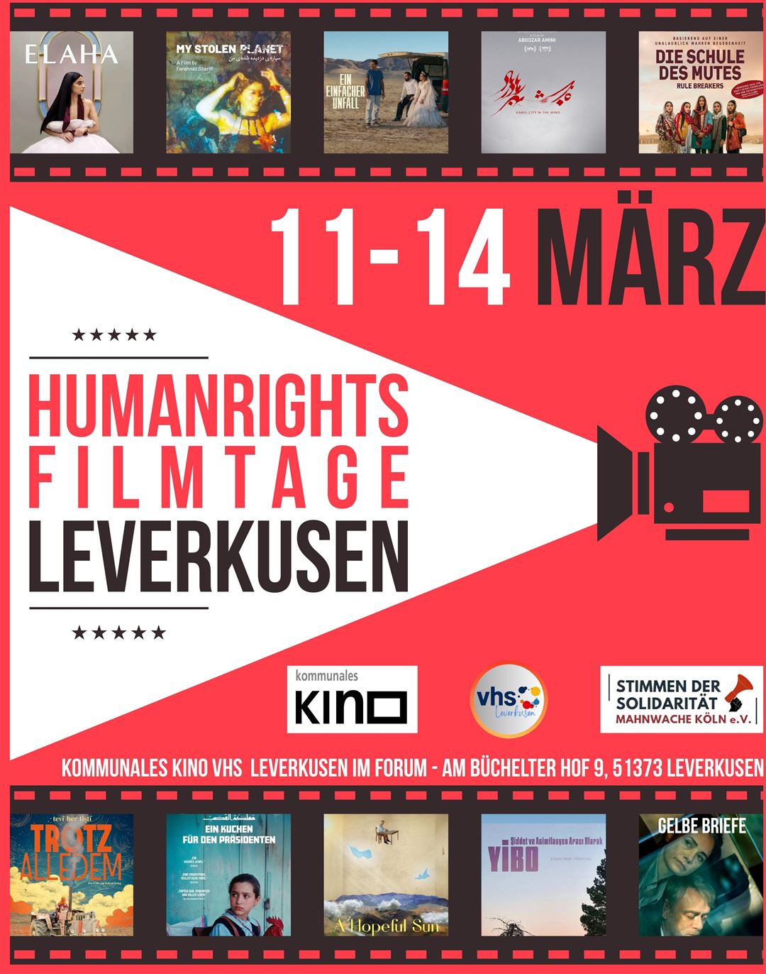 Die "Human Rights Filmtage Leverkusen 2026" sind ein viertägiges Film- und Diskursfestival vom 11.3. bis zum 14.3.2026, das sich dem Thema Menschenrechte in Krisenregionen widmet. Im Fokus stehen fünf Länder bzw. Regionen: die Türkei, der Iran, der Irak, Syrien und Afghanistan.